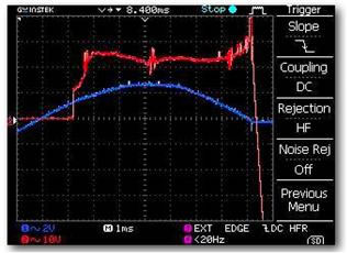 由于电感、浪涌电压峰值瞬间上升,一个未连接抗干扰灭弧器与连接抗干扰灭弧器2个波形进行对比,由图可见连接了抗干扰灭弧器的峰值被吸收,整个波形比较平滑,因此生成的浪涌干扰也被消除或大大的减少。