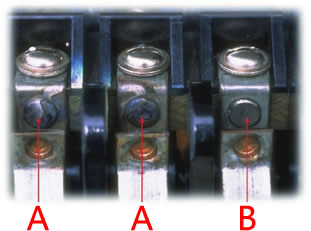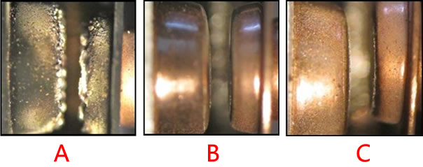 上图左侧两个触点(A)未受抗干扰灭弧器保护的触点,右侧(B)是受抗干扰灭弧器保护的触点,两者在相同的试验条件下,A处接触点被电火花造成损耗、变形、熔铸和表面酸化电阻增加、接触不良等,使接触点的寿命降低。B处接触点为了防止电火花的发生插入了抗干扰灭弧器从而对回路火花进行了吸收使接触点仍然完好无损。